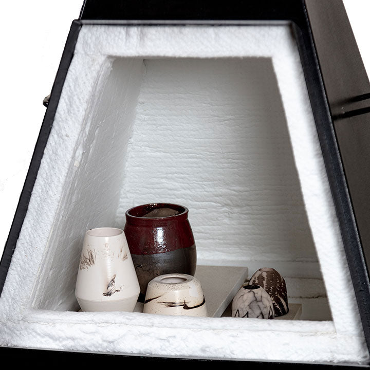 Weighing only 75 kg at the top section, it’s easy to move thanks to two exterior handles. The kiln top can also be interchanged between a wood-firing base or a gas-firing hearth, offering true versatility. Its side-opening, sloping door design provides a secure seal while staying easy and safe to open—even mid-firing—perfect for observing glaze melt during RAKU firings.